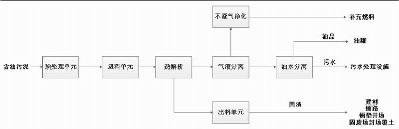 工藝流程:采用熱解技術(shù)外部加熱形式,將物料加熱至300~500℃,含油污泥中的水、油品等在密閉無(wú)氧空間中蒸發(fā)析出,經(jīng)過(guò)冷凝系統后使揮發(fā)物凝結,在通過(guò)油水分離裝置分離出油品,油品經(jīng)過(guò)加工后出售。產(chǎn)出的不凝氣可作為補充燃料使用。